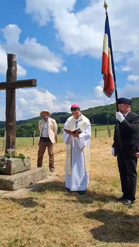 Après un pique-nique dans le parc du château de Contenson, a eu lieu la bénédiction de la croix de l’Echenault, sous le mont Beuvray, par Monseigneur Drouot vers 15 h 00.