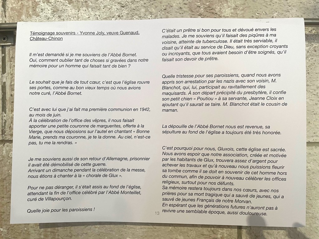 L’exposition sur l’Abbé Bornet et sur la Résistance dans le clergé du Morvan, installée dans l’église à l’occasion de cette commémoration accueillit ses premiers visiteurs après cette célébration.