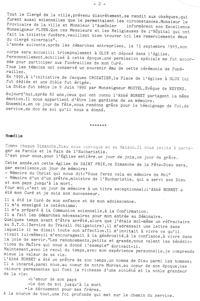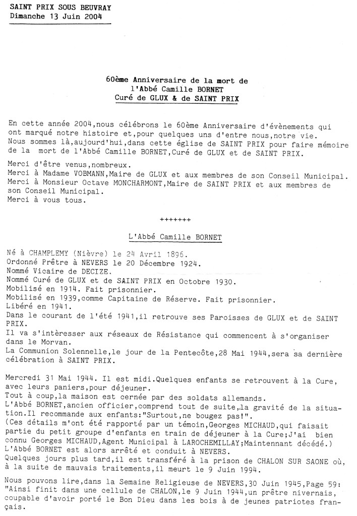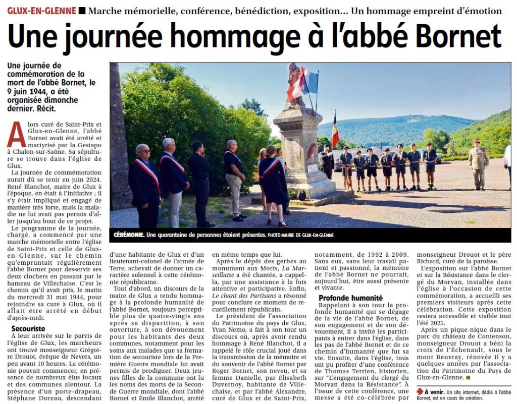 Alors curé de Saint-Prix et Glux-en-Glenne, l’abbé Bornet avait été arrêté et martyrisé par la Gestapo à Chalon-sur-Saône. Sa sépulture se trouve dans l’église de Glux.