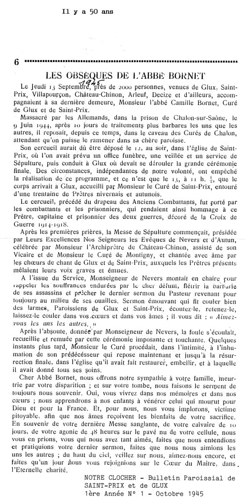 Le jeudi 19 septembre 1945, près de 2 000 personnes, venues de Glux, Saint-Prix, Villapourçon, Château-Chinon, Arleuf, Decize et d’ailleurs, accompagnaient à sa dernière demeure, Monsieur l’abbé Camille Bornet, Curé de Glux et de Saint-Prix.