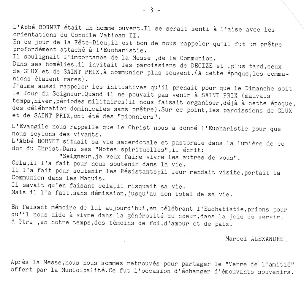 Pour moi, c’est un jour de mémoire à un titre exceptionnel ; l’Abbé BORNET a été mon Curé et je suis son successeur.