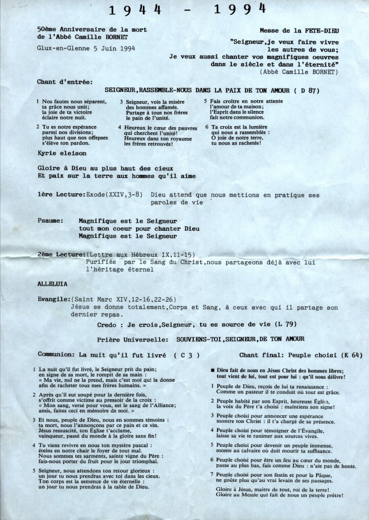 Nous sommes là, aujourd’hui, dans cette église de SAINT PRIX pour faire mémoire de la mort de l’Abbé Camille BORNET, Curé de GLUX et de SAINT PRIX.