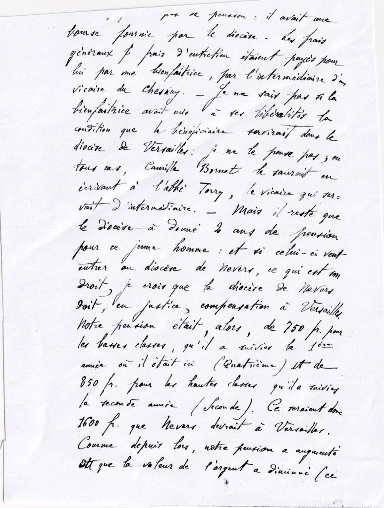 Avant de vous donner mon témoignage sur Camille Bornet, j’ai tenu à savoir dans (…lacune…) de pension : il avait une bourse fournie par le diocèse. Les frais généraux et les frais d’entretien étaient payés pour lui par une bienfaitrice, par l’intermédiaire d’un vicaire du Chesnay. Je ne sais pas si la bienfaitrice avait mis à ses libéralités la condition que le bénéficiaire servirait dans le diocèse de Versailles : je ne le pense pas, en tous cas, Camille Bornet, le saurait en écrivant à l’abbé Torry, le vicaire qui servait d’intermédiaire. Mais il reste que le diocèse a donné deux ans de pension pour ce jeune homme : et si celui-ci veut entrer au diocèse de Nevers, ce qui est son droit, je crois que le diocèse de Nevers doit, en justice, compensation à Versailles. Notre pension était, alors, de 750 Fr. pour les basses classes, qu’il a suivies la première année où il était ici (Quatrième) et de 850 Fr. pour les hautes classes qu’il a suivi la seconde année (Seconde). Ce seraient donc 1600 Fr. que Nevers devrait à Versailles. Comme depuis lors, notre pension a augmenté et que la valeur de l’argent a diminué (ce …lacune… même), je crois que je n’exagère rien en vous demandant la susdite somme comme une compensation qui me paraît due au diocèse.