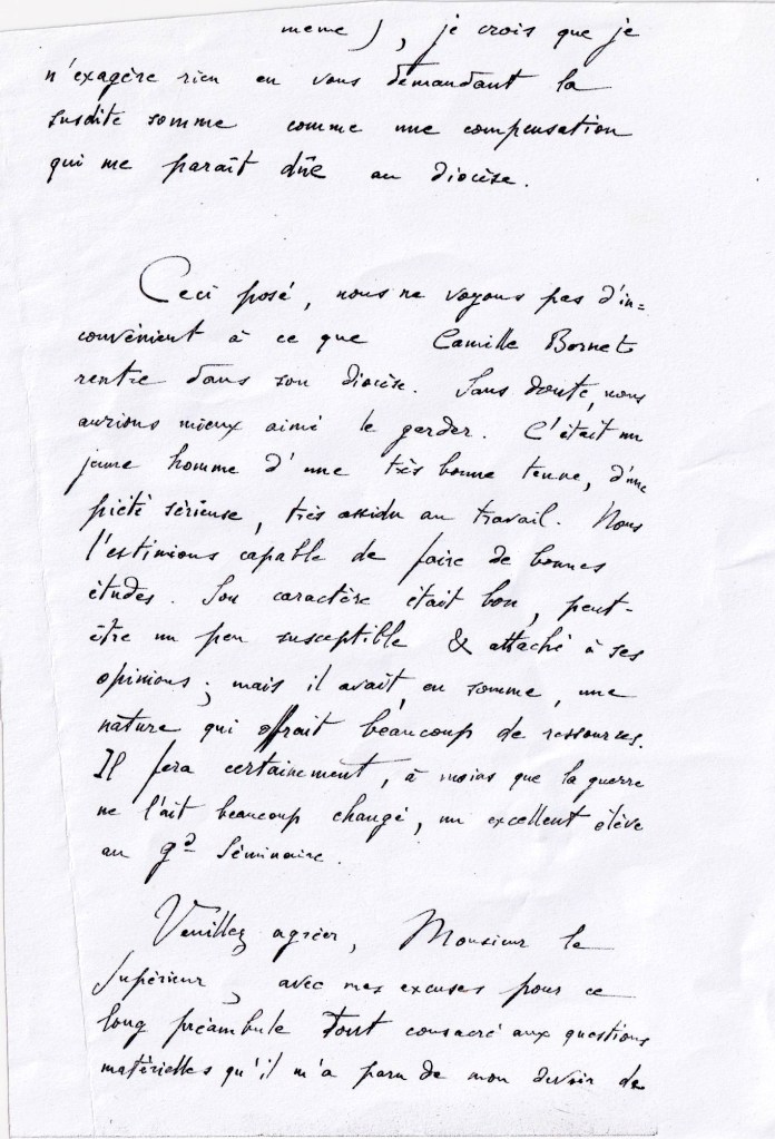 Ceci posé, nous nous voyons pas d’inconvénient à ce que Camille Bornet rentre dans son diocèse. Sans doute, nous aurions mieux aimé le garder. C’était un jeune homme d’une très bonne tenue, d’une piété sérieuse, très assidu au travail. Nous estimions capable de faire de bonnes études. Son caractère était bon, peut-être un peu susceptible et attaché à ses opinions ; mais il avait, en somme, une nature qui offrait beaucoup de ressources. Il fera certainement, à moins que la guerre ne l’ait beaucoup changé, un excellent élève au grand séminaire.