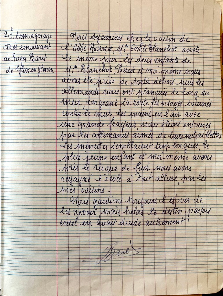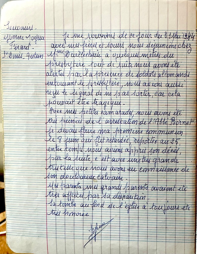 « Nous déjeunions chez le voisin de l’Abbé Bornet, M. Émile Blanchot, arrêté le même jour. Les deux enfants de M. Blanchot, Pierrot et moi-même, nous avons été priés de sortir dehors, puis les Allemands nous ont plaqués le long du mur longeant la route, les visages tournés contre le mur, les mains en l’air. Avec une grande frayeur, nous étions entourés par les Allemands armés de leurs mitraillettes. Les minutes semblaient trop longues, le plus jeune enfant et moi-même avons pris le risque de fuir, nous avons regagné l’école à toute allure, par les prés voisins. »