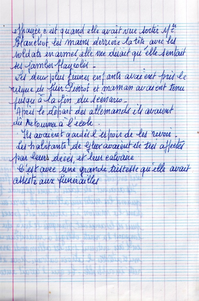 Présente elle aussi dans la maison d’Émile Blanchot, la sœur de Roger, Raymonde, plus âgée et très marquée par l’événement, précise :