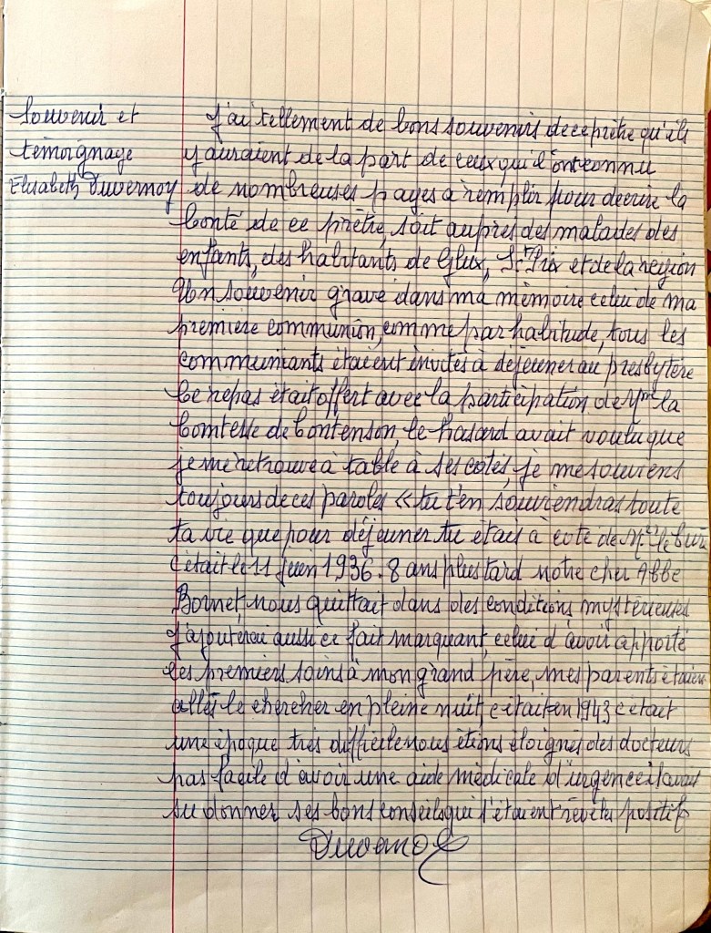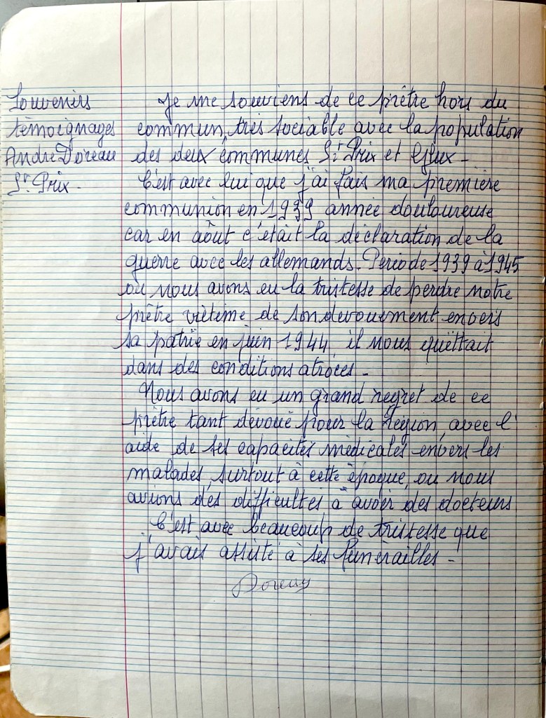 J’ai tellement de bons souvenirs de ce prêtre qu’il y aurait de la part de ceux qui l’ont connu de nombreuses pages à remplir pour décrire la bonté de ce prêtre, soit auprès des malades, des enfants, des habitants de Glux, Saint-Prix et de la région.