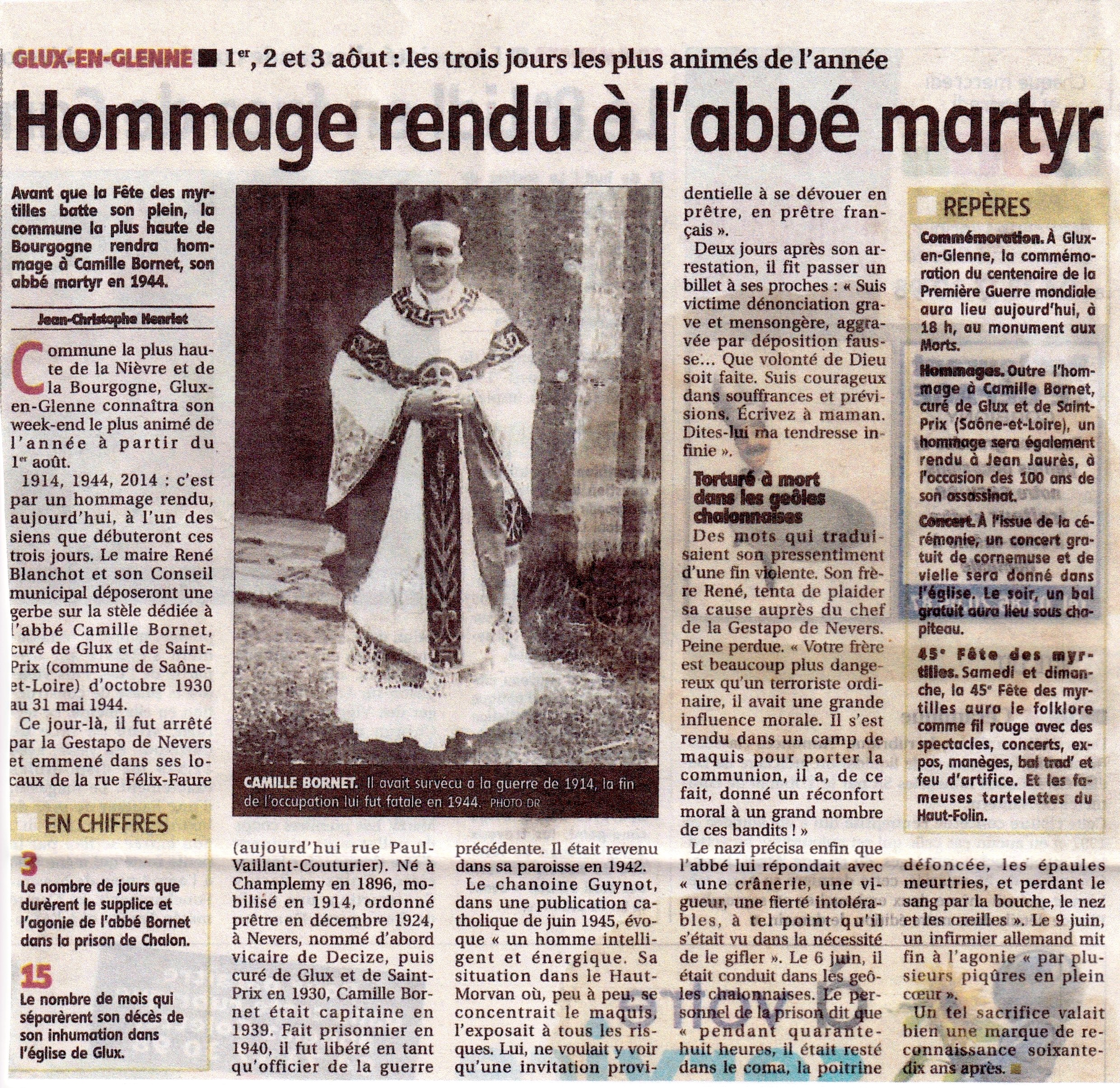 1914, 1944. 2014 : c’est par un hommage rendu, aujourd’hui, des siens que débuteront ces trois jours. Le maire, René Blanchot et son conseil municipal, déposeront une gerbe sur la stèle dédiée à l’abbé Camille Bornet, curé de Glux et de Saint-Prix (commune de Saône-et-Loire), d’octobre 1930 au 31 mai 1944.
