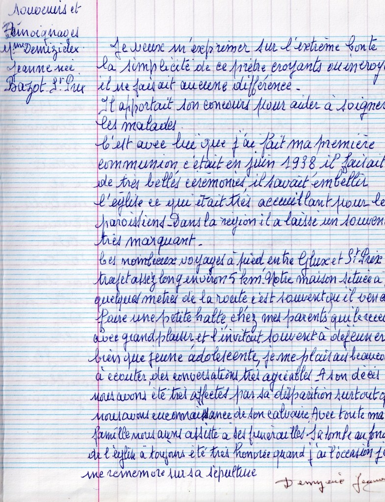 Le chanoine Guynot, dans une publication catholique de juin 1945, évoque « un homme intelligent et énergique. Sa situation, dans le Haut-Morvan, où, peu à peu, se concentrait le maquis, l’exposait à tous les risques. Lui, ne voulait y voir qu’une invitation providentielle à se dévouer en prêtre, en prêtre français ».