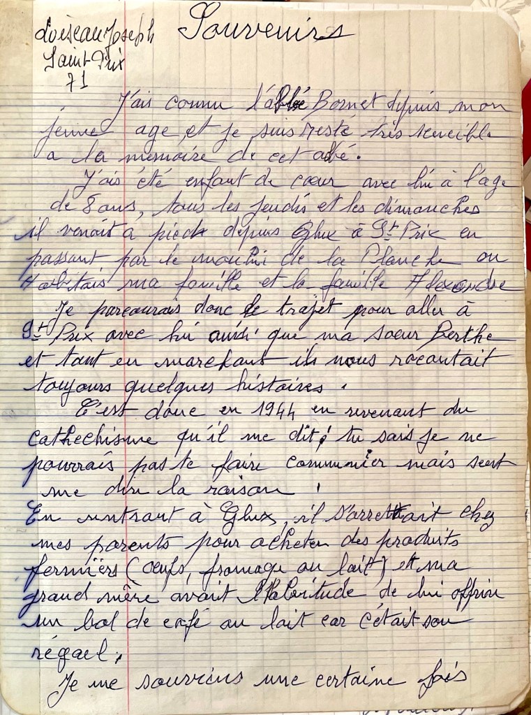 Tous les jeudis et les dimanches, il venait à pied depuis Glux à Saint-Prix en passant par le moulin de la Planche, là où habitait ma famille et la famille Alexandre.